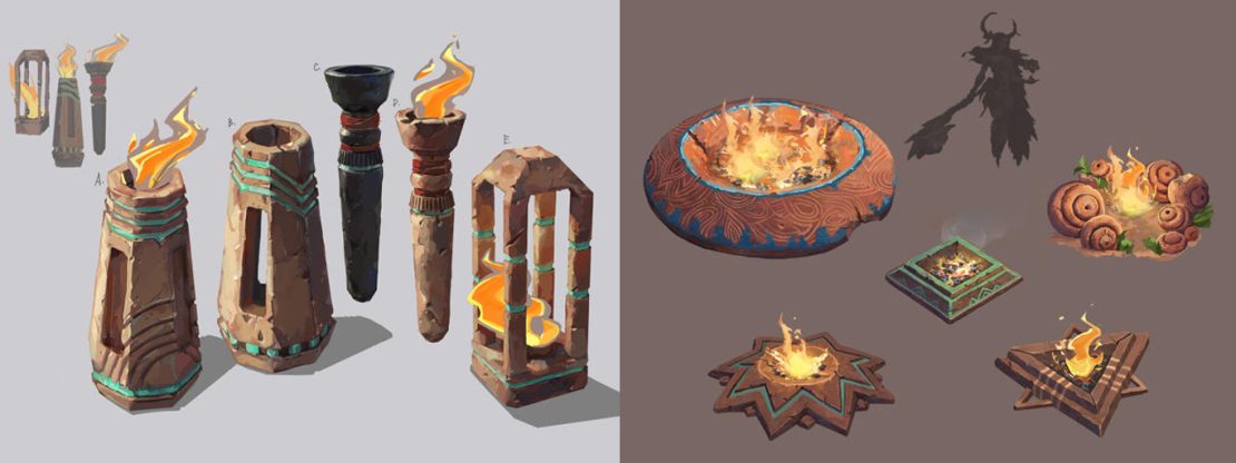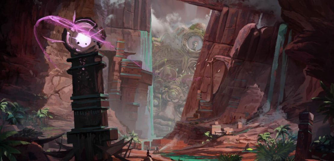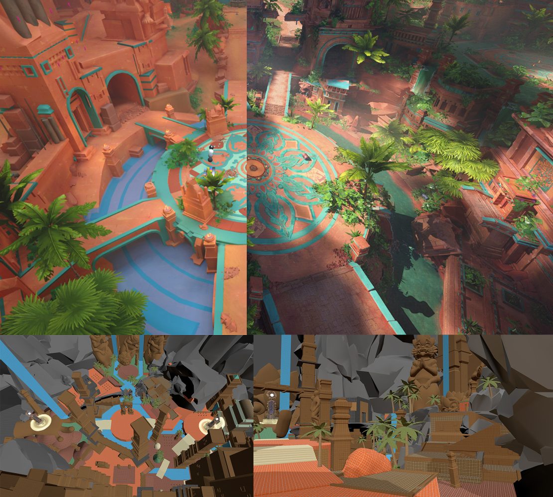 In the heat of battle, sightseeing in Ashkenon is not the main focus; this painstaking work ensures that Spellcasters, once past the initial visual impression, can navigate a 3D space instinctively. Paul illustrates this with the geometry of the lanes, which must clearly indicate accessible paths for summoned creatures while staying true to the overall aesthetic: “The Mausoleum allowed us to test every design idea to differentiate the ground from the rest of the environment; in cities, for example, we have sidewalks, we use them without thinking. In this arena, we played with ruins and vegetation, which fit the overall visual identity while enhancing readability during movement. Sometimes our artistic ambitions slow us down a bit, but once the lighting artists come in for the final touch, we’re always amazed at how they elevate our work!” A sentiment also shared by Maxence, pleased with the balance achieved: “I’m proud of the story we managed to tell with this arena, whether it’s the great gate, the dwellings, the jungle… We managed to include everything we wanted while keeping the practical aspect, which is essential for gameplay feel.”
