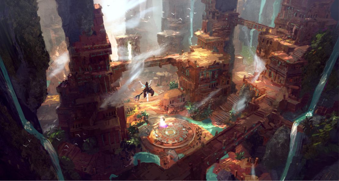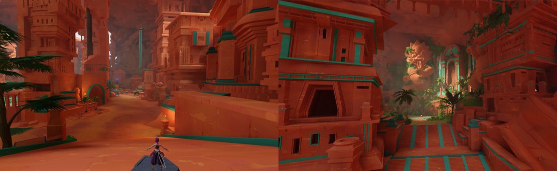 The Mausoleum reflects a dense, lush, even glorious past, now forgotten by most. It also gave Ronan and team the opportunity to add unique decorative elements while maintaining strong gameplay readability, even during intense action: “We played with the contrast between the canyon’s surface, raw, grainy, textured, and the statues leaning against it, which have a smoother, more refined aesthetic. It gives character while providing very clear volume cues. The same goes for the patterns on the ground and buildings, which echo the Astral Monk while also structuring the pillars, reinforcing the sense of a majestic place, but also giving spatial cues to players.”