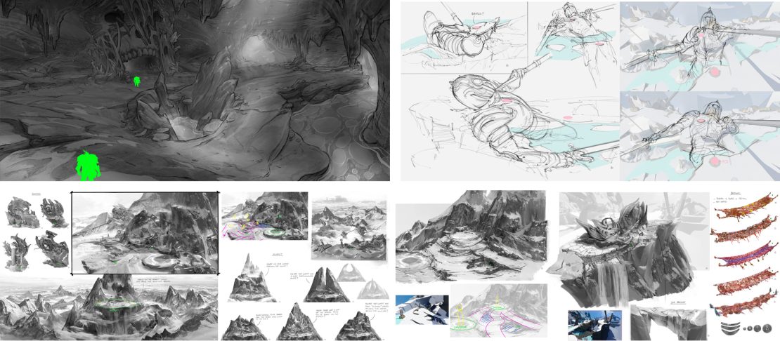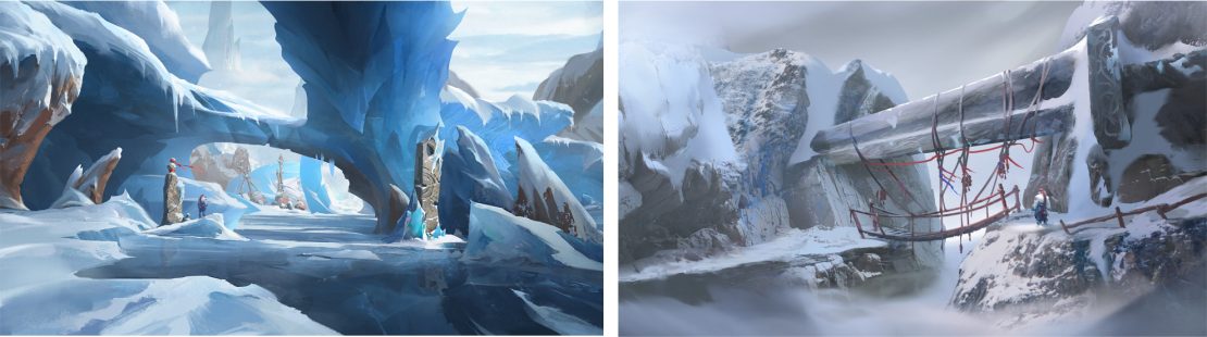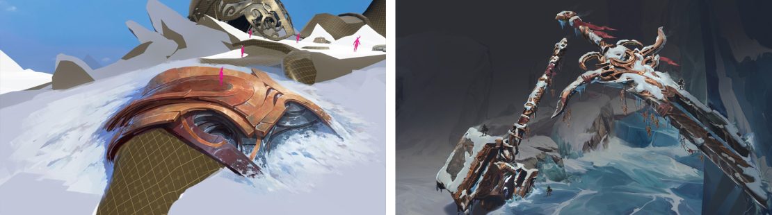 “It’s the roof of the world, quite literally, with a twist: fallen Titans are one with the mountains. It needed to feel both wild and isolated yet also imbued with a sense of spirituality. Cultural markings can be seen carved directly into the rock or onto the petrified Titans’ armours. It’s a sacred place for the Boreal civilization.” And for the art director and his team, a fantastic playground where environment and character design meet.