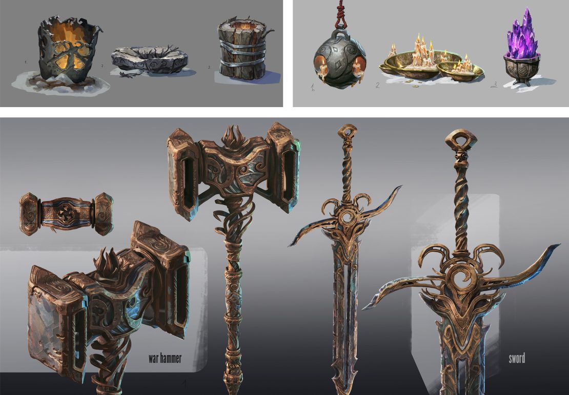 The Mountains of Kamazad and the Stone Shaman are intricately bounded, going back to the first Boreans who set foot onto this rather inhospitable land. Drawn by the raw magic emanating from the Titans’ ancient bodies, they began to change: their skin hardened like stone, crystalline growths formed across their face, and their stature grew tall and powerful. The titanic corpses became sacred places of worship, adorned with hanging bells, carved symbols, and offerings of reverence. Art director Ronan Berlese began the creative process with titbits of ideas which eventually turned into this full arena: mountains, cold, Boreans. Not much at first sight, though opening a realm of possibilities! “I wanted to convey the feeling of a pilgrimage site — the culmination of a long initiatory journey,” Ronan explains.